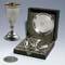 4 Teile: 1 rundes Tablett, 3er Satz Likörbecher,